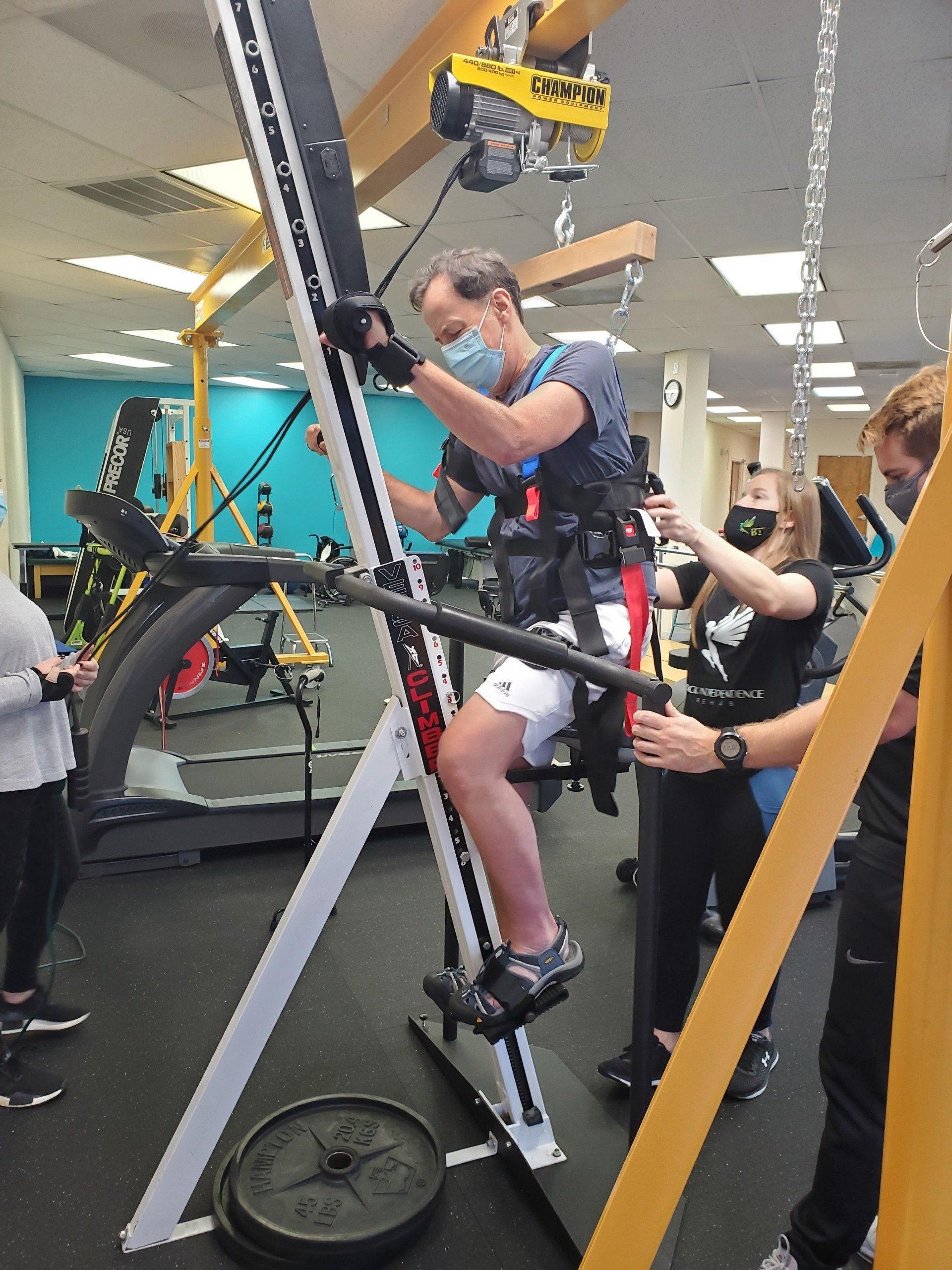 At BTI Rehab we provide activity-based therapy to promote neuroplasticity to aid the nervous system’s ability to change connection in response to new information and stimulation. Activity based therapy incorporates weight-bearing activities, functional electrical stimulation, task specific practice, massed practice, and locomotor training. A lot our neuro rehab is focused on central pattern generators (CPGs). CPGs are specialized spinal circuits involved in the control of rhythmic locomotor pattern generation and modulation. These could be crawling, walking, running, or even swimming. These CPGs are capable, under some conditions, to self-reproduce, even in the absence of descending or peripheral inputs(normal nerve conduction), basic rhythmic, and coordinated locomotor movements. Though, how do we train to target these CPGs? Oftentimes through repetitive pattern modalities. One of the major aspects of training we provide at BTI Rehab is repetitive pattern modalities (RPM). RPM’s have a cyclical nature to the exercise that helps promote health, wellness, and potential recovery by fostering the phenomenon known as neuroplasticity. Exercises are selected on their potential ability to either mimic the intrinsic rhythms of central pattern generators that occur during locomotion or develop oppositional firing of antagonistic muscle groups. Some examples of this are treadmill, elliptical, or versa climber training through our body weight support system (BWSS).